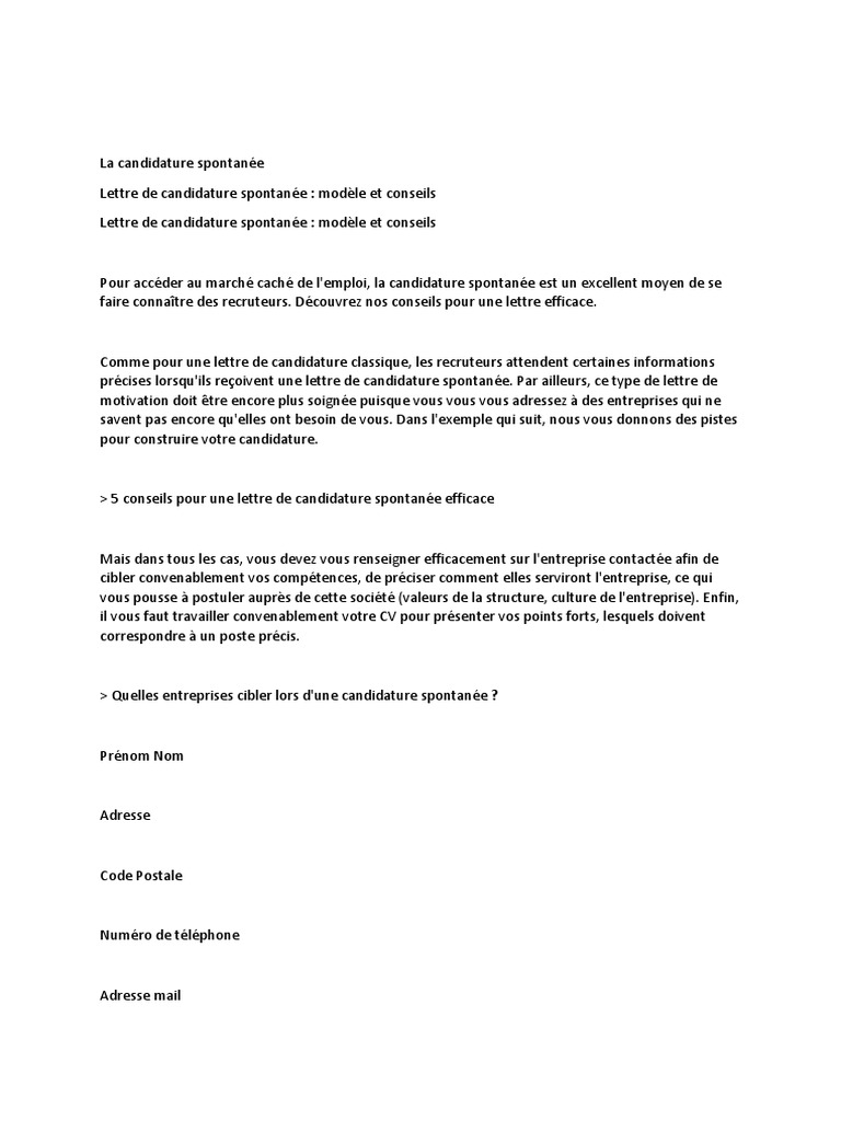 Candidature spontanée pour tout poste vacant actuel p.j. Pour ma part, je dirais que non, car justement vous envisagez rédiger une lettre de motivation sans poste précis. La lettre de candidature spontanée ne doit pas faire plus d'une page. Parce que l'orientation politique de votre commune rejoint vos. La lettre de candidature spontanée.