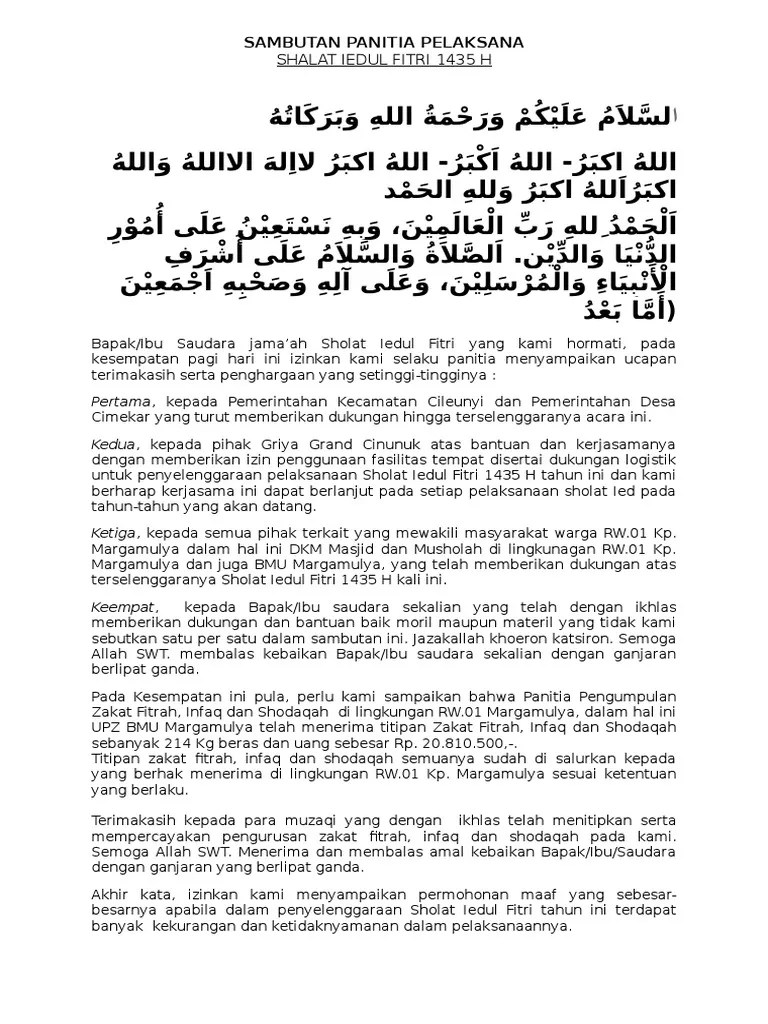 Demikian sambutan yang bisa kami sampaikan, mohon maaf jika ada kekurangan, sekian dari saya, akhirul kalam saya ucapkan. Puji syukur senantiasa kita panjatkan kehadirat illahi rabbi allah swt, shalawat dan salam semoga selalu tersampaikan kepada junjungan kita nabi muhammad saw, keluarga dan para … Menyambut bulan suci ramadhan tahun ini dilakukan secara berbeda oleh pengurus masjid mujahidin kelurahan karangduak kecamatan kota kabupaten sumenep. Salam dah sholawat semoga senantiasa tercurahkan kepada baginda nabi besar muhammad saw, beserta keluarga, para sahabat, dan pengikutnya … Contoh pidato sambutan ketua panitia pembangunan masjid.
